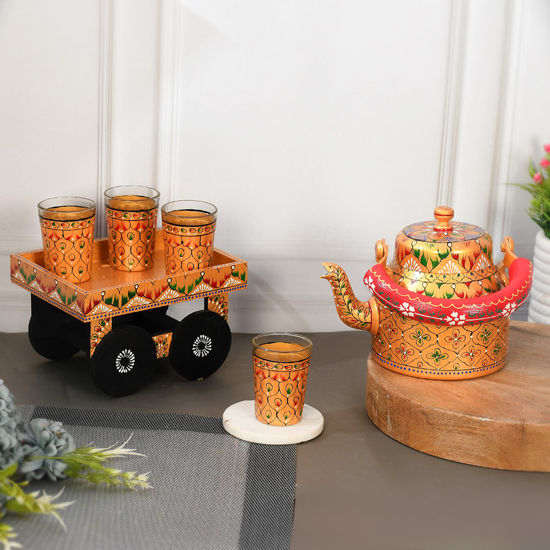Handmade Kettle with Four Glasses and Wooden Kart “Are you hosting a high tea party? This unique and exceptional teapot is not to be missed! There are scones on the table. Not any longer! Every visitor to the room is envious of this exquisite hand-painted colorful teapot from Ship Lam Creations.
