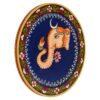 This hand-painted pichwai wall plate features Ganesha, the Hindu god of wisdom and prosperity. He is depicted with a flower on a blue plate, surrounded by flowers and a horse. The intricate details and vibrant colors make this a beautiful piece of art for any home.